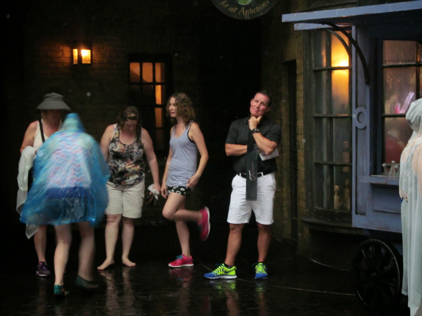 During the afternoon of our first day in the park the sky just exploded with rain. Everyone scrambled to find a roof or awning to wait under. It rained for a long time and people just sat waiting, including us. Easton and I went exploring in some dark, cold alleys called Knockturn Alley. It was seriously dark and evil. After about an hour we braved getting wet, went to a store and bought cheap plastic rain ponchos and carried on. Rides were all shut down from the rain but we were still able to enjoy the park and went on some of the indoor rides.